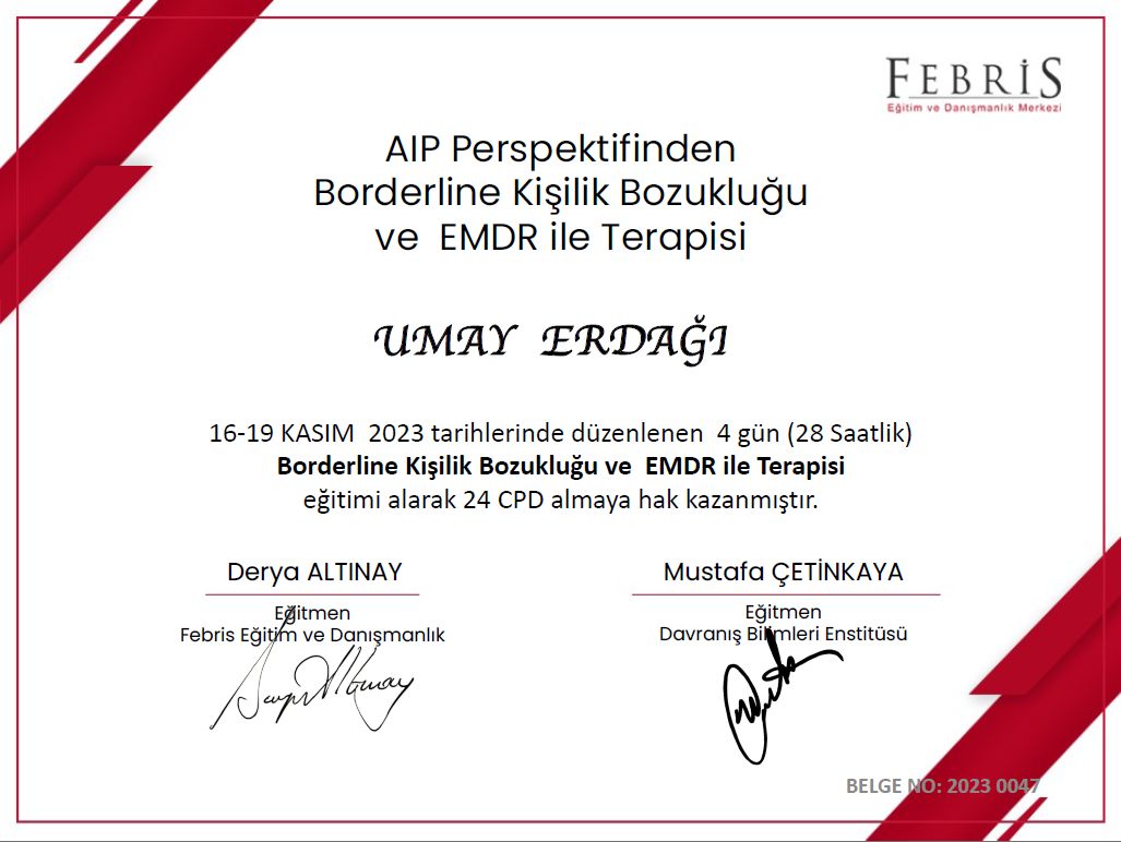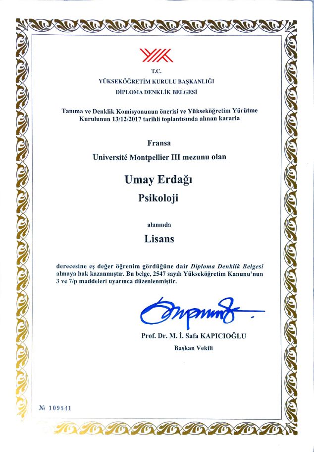 Daha önce 3 ayrı psikologla danışmanlık sürecim olduğu için, gönül rahatlığıyla söyleyebilirim ki, Umay Bey bu işi hakkıyla yapıyor hele de ülkemizde psikolog sayısının artışıyla düşen nitelik ile önyargı ile başlamıştım, şimdi iyi ki diyorum kendini bu alanda sürekli geliştiren donanımlı bir psikolog ile tanışmışım, sürecimden oldukça mutluyum, daha çok insana değebilir umarım, çünkü insan psikolojisi öyle herkese emanet edilemiyor deneyimledim.